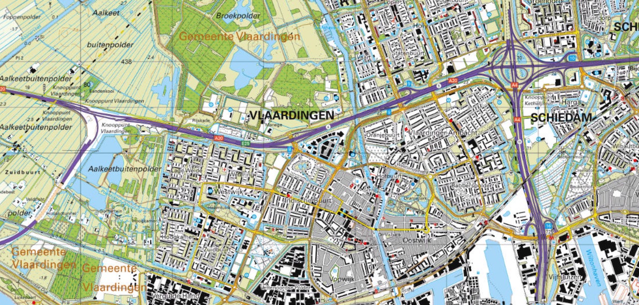 De afgelopen 100 jaar zijn Vlaardingen en Schiedam aan elkaar gegroeid en is Vlaardingen ook stevig westwaarts en noordwaarts uitgebreid. Toch zie je hier dat er ook een duidelijke grens is aangebracht tot waar de verstedelijking mocht komen. Aan de westzijde gaat Vlaardingen over in het recreatiegebied in de Aalkeetbuitenpolder en ten zuiden daarvan is de Zuidbuurt enigszins open gebleven. Al snijdt de nieuwe Blankenburgtunnel daar natuurlijk wel stevig doorheen.